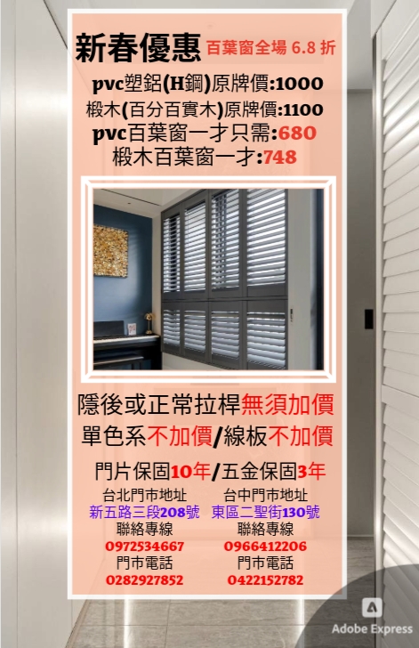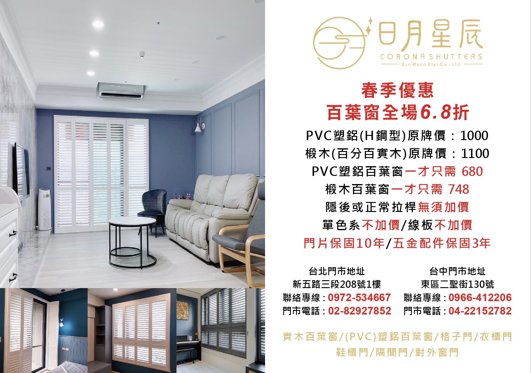 日月星辰實木百葉窗 最新春季優惠 全場6.8折